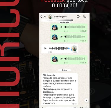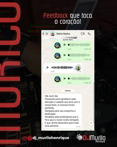 Receber mensagens como a da Elaine mostra que cada detalhe fez a diferença! O carinho com a escolha das músicas e o cuidado com a festa resultaram em uma experiência inesquecível. DJ Murilo entrega mais do que som: entrega emoção e profissionalismo. 📍 Atendemos Franca e região 📲 WhatsApp: (16) 99999-1081 📸 Instagram e Facebook: @djmurilooficial