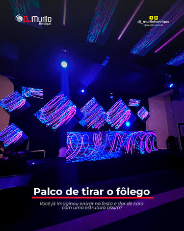 Você já imaginou entrar na festa e dar de cara com uma estrutura assim? Luzes que dançam com a música, painéis que hipnotizam e uma experiência visual que eleva qualquer evento a outro nível. Essa é a estrutura completa que o DJ Murilo Henrique entrega: um espetáculo para os olhos e ouvidos! Com tecnologia de ponta, projeções mapeadas e um design inovador, o ambiente se transforma em um verdadeiro show à parte. Seja para casamentos, formaturas ou eventos corporativos, levamos impacto visual e sonoro com excelência. A sensação é de estar em um palco de festival, mas com a sua cara! Quer sua festa com esse nível de produção? Entre em contato agora com DJ Murilo Henrique e surpreenda seus convidados!